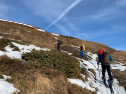Am Samstag geht´s dann los auf Tour. Wir nehmen den Postbus bis zum Turrahus, Thalkirch. Von dort steigen wir über eine dünne Schnee-Spur vorbei an bereits freien Wiesenhängen. Je höher wir kommen, desto weißer wird die Umgebung und nach einem knapp 4-stündigen Aufstieg erreichen wir den besonderen Gipfel des Piz Tomüls. Nach einer gemütlichen Mittagspause in der Sonne machen wir uns auf den Rückweg. Der Gipfelhang – man kann es kaum glauben – hat so guten Schnee, dass wir die letzten Höhenmeter direkt nochmal aufsteigen und anschließend - ohne Abschnallen zu müssen - ins Tal abfahren.