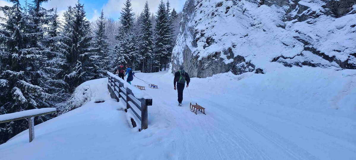 Kürzlich organisierte eine kleine Jugendgruppe der Alpenvereinsjugend Hechingen eine Rodelfreizeit in den Bayrischen Voralpen. In der Sport-Jugendherberge in Bad Tölz kam die Gruppe passend unter. Von dort aus ging es auf der ersten Tour in der Nähe von Kreuth am Tegernsee auf dem Waldweg, der gleichzeitig auch die Rodelstrecke war, zu Fuß auf die Buchsteinhütte. Die Abfahrt wechselte zwischen steileren und auch flacheren Passagen ab. Am Abend konnten dann noch die Arm- und Beinmuskulatur in der danebenliegenden Kletter- und Boulderhalle ebenfalls beansprucht werden.