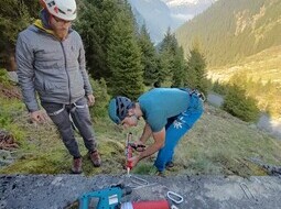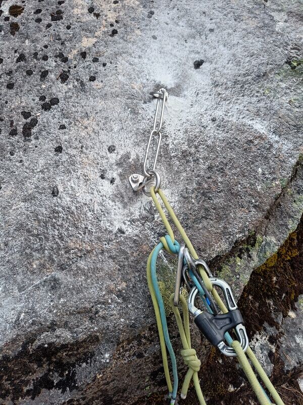 So treffen wir - vollgepackt mit tollen Sachen - an einem verregneten Morgen auf dem Zeltplatz im Göschner Alptal zusammen. Nach einer Einführung starten wir in die wilde Materialschlacht. Der Klettergarten direkt am Zeltplatz soll saniert werden: Rostgurken raus und feinste Inoxbohrhaken rein. Als Umlenker kommen Kettenstände mit Ring oder gar Karabiner zum Einsatz. Für die Sanierungen erhalten wir Material von rebolting.ch. Dieser Verein unterstützt in der ganzen Schweiz nachhaltige Sanierungen und versorgt uns auch kurzfristig mit Nachschub.