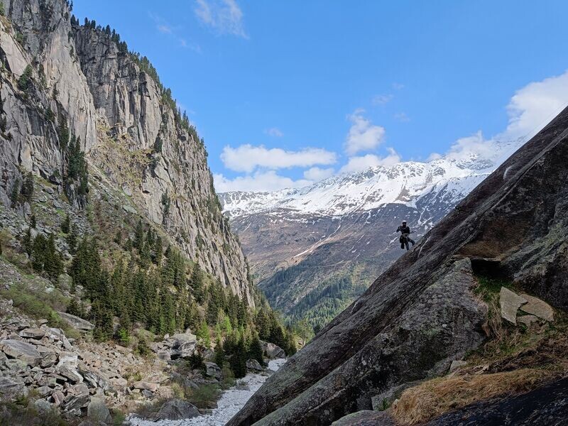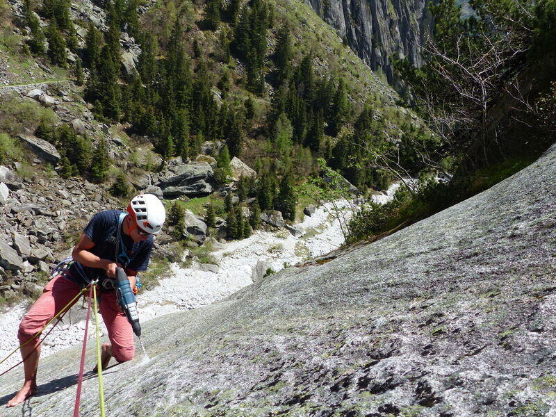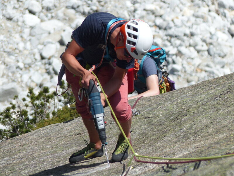 So schnürt jeder nach bestem Wissen und Gewissen "runde" Tourenpakete. Meist wird im Vorstieg erschlossen, aber auch hier stellt sich manchmal die Frage, welchen Mehrwert man sich und der Welt damit generiert. Mit einer Bohrmaschine im Vorstieg Platten schleichen ist auf jeden Fall ein besonderes Erlebnis! Alternativ kann man Routen natürlich auch von oben einrichten, was gerade in sehr schweren Sportkletterrouten der Standard ist. Aber das genießt in der Kletterwelt nunmal nicht das gleiche Ansehen, wird teilweise gar komplett abgelehnt und ist in (alpinen) Mehrseillängen häufig keine Option.