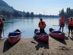 Am nächsten Tag ging es dann wieder bei strahlendem Sonnenschein weiter auf dem Rhein Richtung Schaffhausen. Das Paddeln fiel hier deutlich leichter, da die Strömung trotz Niedrigwasser viel größer war als auf dem Bodensee. Auch luden immer wieder schöne Badebuchten zum Baden ein bzw. bestand die Möglichkeit, sich mit den Schwimmwesten treiben zu lassen. Kurz vor dem Strandbad Langwiesen vor Schaffhausen hatte dann die Gruppe gegen Mittag ihr Ziel erreicht. Baden, Vespern, Kanus verladen und die Heimfahrt besiegelten wieder einmal ein viel zu schnell zu Ende gehendes Wochenende.