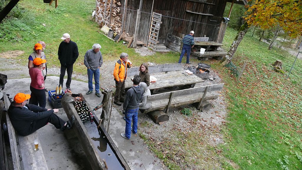 Fünf Ster Brennholz waren an der Nessler-Hütte angeliefert worden, die aufgeräumt und eingelagert werden mussten. Fünf von uns schichteten tapfer und unermüdlich bei strömendem Regen das Holz auf. Durchgefroren und nass bis auf die Haut freuten wir uns auf das Vesper in der mollig warmen Küche der Nessler-Hütte. Die Länge der Pause richtete sich nach dem Trocknen der Arbeitskleidung. Satt, aufgewärmt und mit einigermaßen trockener Kleidung erledigten wir den Rest der Arbeiten, bevor es zurück in unsere gemütlich Stocker-Hütte ging.