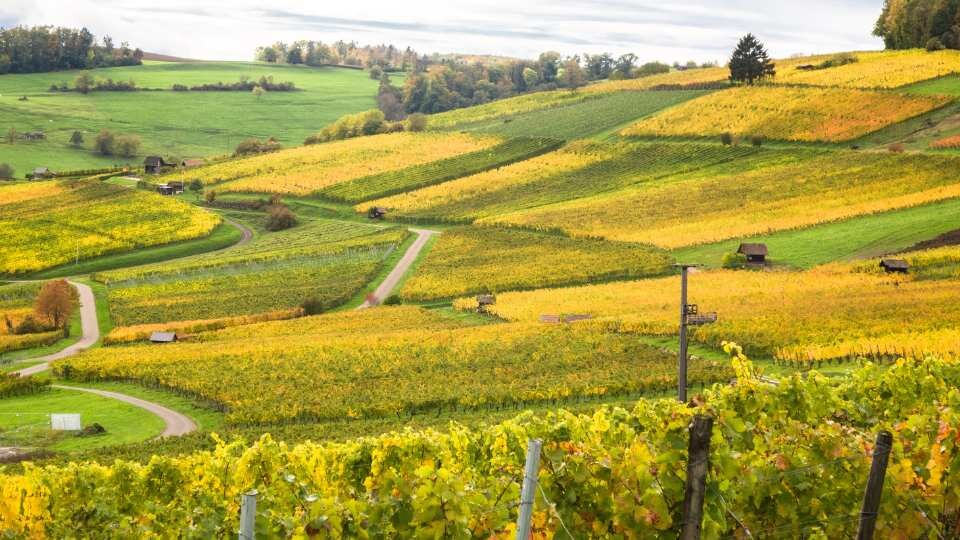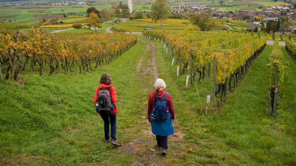 Blauburgunderland nennt die Schweizer Tourismuswerbung ihren Landzipfel bei Schaffhausen, das nördlichste Stück der Schweiz. Tatsächlich eine ausgedehnte Weingegend – und eine sehr schöne dazu. Dorthin führte die traditionelle Herbst-Auslauftour. Zunächst auf den Blauburgunder-Panoramaweg. Die Sonne schien sogar (das mit dem Wetter war ein bisschen ein Poker, weil für den direkt angrenzenden Schwarzwald Dauerschütten angesagt war), die Weinblätter leuchteten in allen Herbstfarben, Aussichtshöhen und eine Bergkirche boten besondere Anlaufpunkte, und am Horizont zeigten sich sogar die Alpengipfel.