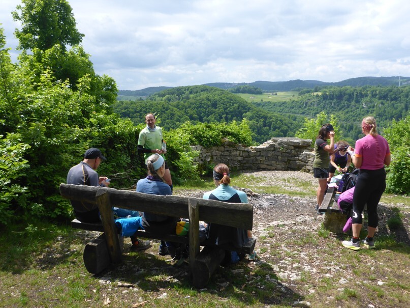 Pünktlich am Freitagmorgen startete unser Abenteuer mit einer gemeinsamen Bahnfahrt nach Lichtenstein-Unterhausen – klimafreundlich und entspannt. Pünktlich gegen 9 Uhr ging es auf den Trail, immer entlang am Albtrauf. Mit leichtem Trailrucksack, der nur das Nötigste zur Übernachtung, Kleidung zum Wechseln und Energieriegel, Nüsse, Trockenobst und Getränke enthielt, machten wir uns auf den Weg. Die Route führte uns entlang herrlicher Singletrails, stets dem Albtrauf folgend.