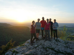 Auf schönen Waldwegen mit weiteren Anstiegen kamen wir kurz vor Sonnenuntergang an den Wackerstein, ein weiterer herrlicher Aussichtspunkt am Albtrauf und zugleich der höchste Punkt unserer Tour. Dort entstand auch unser Gruppenfoto. Wir hatten uns mittlerweile akklimatisiert und ich habe mich richtig wohl gefühlt in dieser Gruppe. Die Abendstimmung konnte ich voll genießen.