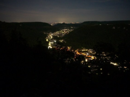 Inzwischen ist auch die Dunkelheit über uns hereingebrochen, so dass wir auf den Waldwegen jetzt meist unsere Stirnlampen brauchten. Nun mussten wir uns mehr auf den Weg konzentrieren und es wurde allmählich leiser. Aaron führte uns zu einer kleinen Höhle mit Felsformationen, die wie mit Zuckerguss überzogen schienen und uns sehr beeindruckten. Kurze Zeit später erreichten wir den Gießstein mit Blick auf Unterhausen und Honau bei Nacht. Auf dem Weg entlang des Albtraufs konnten wir immer wieder Blicke auf das von Schweinwerfern angestrahlte Schloss Lichtenstein erhaschen. Eine kurze Pause am Traifelberger Skilift, mit weitem Blick in die Nacht- und dann ging`s weiter den Burgenweg entlang vorbei an beeindruckenden Felswänden nach Holzelfingen.