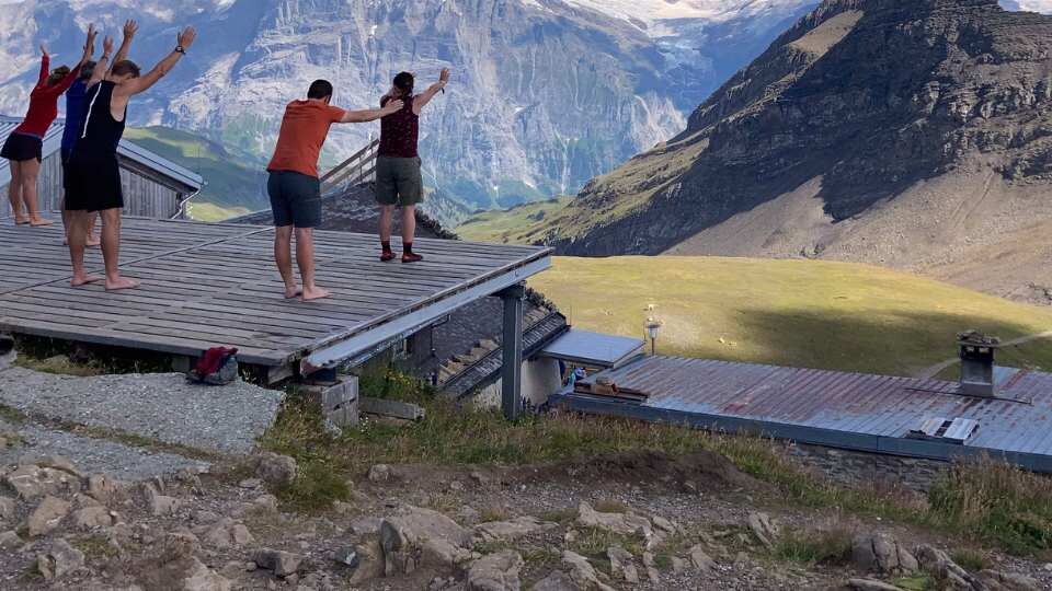 Die visuellen Reize dieser Wanderung waren überwältigend - nicht nur das Dreigestirn Eiger-Mönch-Jungfrau berührte durch seine Schönheit, ebenso die vielfältige Landschaft unterwegs - mal heidig, mal mondartig geröllig, mal über Kuh- und Schafweiden oder durch dichte Nadelwälder; immer begleitet durch das Spiel von Sonne, Schatten und Licht. Eindrucksvoll war hier vor allen der Sonnenaufgang zu dessen Beobachtung wir frühmorgens eine Anhöhe über dem Berghaus Männdlenen bestiegen. Intensiv erlebbar wurde die Bergatmosphäre aber ebenso haptisch, durch zapfige Anstiege und Yoga-Sessions zur Entspannung der müden Glieder, sowie Bäder in kristallin eiskalten Bergseen. Ebenso geschmacklich durch kulinarische Köstlichkeiten auf den Hütten - ein Highlight war hier das Raclette auf dem Berghaus Männdlenen - aber auch der selbstgemachte Käse auf der Tschingelalp und Himbeer- und Heidelbeerexzesse unterwegs sowie wunderbare Bergkräutertees, deren Ingredienzien unser Franz unterwegs sammelte.