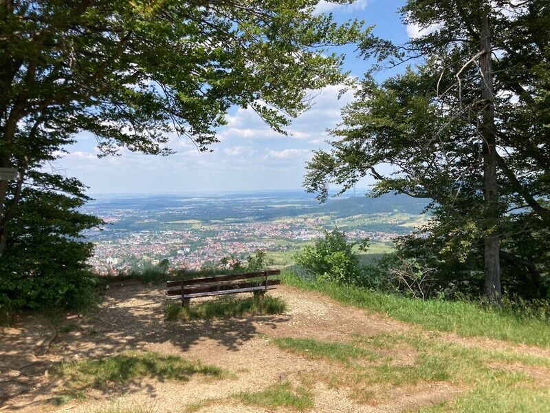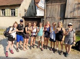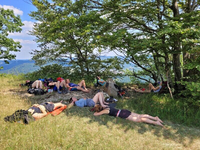 Wir starten die Wanderung in Dotternhausen mit Yoga, einer Blindverkostung (eine lecker riechende Erdbeere) als Einführung in bewusstes, achtsames Essen und konzentrieren uns danach ganz auf die Geräusche um uns herum. Entspannt mit ruhigem Puls und tiefem Atem können uns die Wadenbeisseraufstiege gleich zu Beginn nur wenig anhaben. Die schattigen Waldpfade schlängeln sich den Berg hinauf und schützen vor der brennenden Sonne. Am Trauf genießen wir immer wieder herrliche Aussichten ins Ländle, laufen über Sommerwiesen mit Blumen und Schmetterlingen. Vor unserer Mittagspause gehen wir für eine Stunde schweigend und konzentrieren uns auf die Sommerfarben. Die gemeinsame Siesta unter der alten Eiche beim Hörnle nach dem Mittagessen wird nur von einer Kreuzotter gestört. Die Schmetterlinge sind gern gesehene Gäste auf den Schultern der Schlafenden. Yoga hilft uns wieder auf die Beine und weiter geht’s mit inspirierenden und angenehmen Gesprächen.