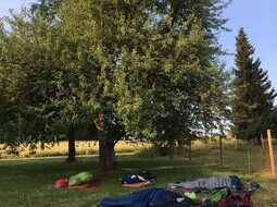 Wir beginnen den neuen Tag ganz entspannt mit leckerem Tee und Müsli auf unserer Wiese im Halbschatten - Yoga machen diesmal unsere einzigen Nachbarn auf der Sonnenterrasse. Und nach einem erfrischenden Bad treten wir erfüllt und beschwingt die Heimreise an.