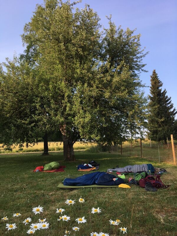 Auf unserer Wiese bei Jochen beenden wir den Tag mit einer ausgiebigen Yogaeinheit und einer langen Endentspannung. Bevor wir uns unter freiem Himmel in unsere Schlafsäcke mümmeln, sitzen wir noch gemütlich am Feuer zusammen und lassen den Tag gemeinsam Revue passieren. Was für viele schöne Momente er doch für uns bereit hielt. Nachts stören uns nur die kämpfenden Ziegenböcke, der stolze krähende Hahn, ein Hund und eine Katze. Doch der Blick hoch in die sternklare Nacht blendet alles Geräusche aus und müde schlafen wir gut und fest.