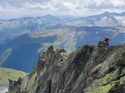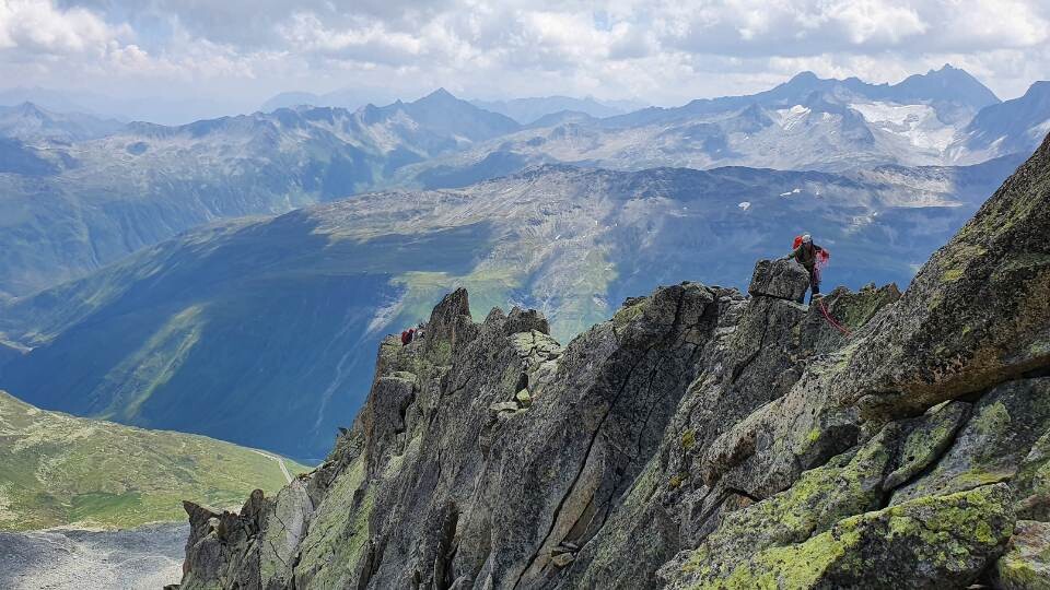 Am nächsten Morgen starteten wir erst um sieben, in der Hoffnung einer anderen Gruppe mit dem gleichen Ziel, bestehend aus sechs Leuten, ausreichend Vorsprung zu verschaffen. Wie viele andere Seilschaften sich diesen schönen Gipfel auch noch ausgesucht hatten, wussten wir zu diesem Zeitpunkt noch nicht. Nur so viel dazu: Es war Sonntag und der Himmel war blau! Achim und ich bildeten die erste Seilschaft, dicht gefolgt von Birgit mit Thomas. Die Kletterei war alpin und die Landschaft grandios. Nach unendlichen Aufschwüngen, Zacken, Türmen und Platten erreichten wir am frühen Nachmittag den Gipfel des Furkahorns (17 SL, 4b) mit einer sensationellen Rundumsicht, auch auf die 4000er des Wallis!